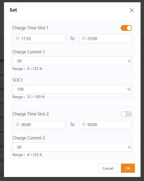 8. Enter the settings you want. If you want a simple overnight charge then you would just fill in Charge Time Slot 1, but there are more charging slots if you need them. If you have a tariff that pays you to export in a particular time window then you might also set a Discharge Time Slot (scroll further down the same dialog). See notes below on Charge Current and SOC. The main ‘gotcha’ to note here is that the Enable sliding button top right must be set for each slot we want to operate, otherwise the slot settings are just ignored.